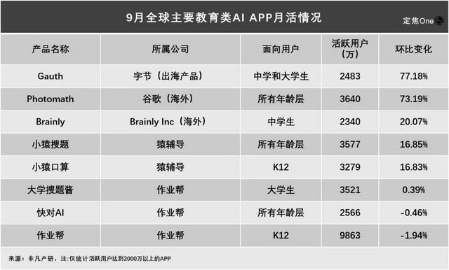 从榜单数据来看,9月月活用户超2000万的教育类AI APP共8款,其中增速最快的是字节的“Gauth”。
